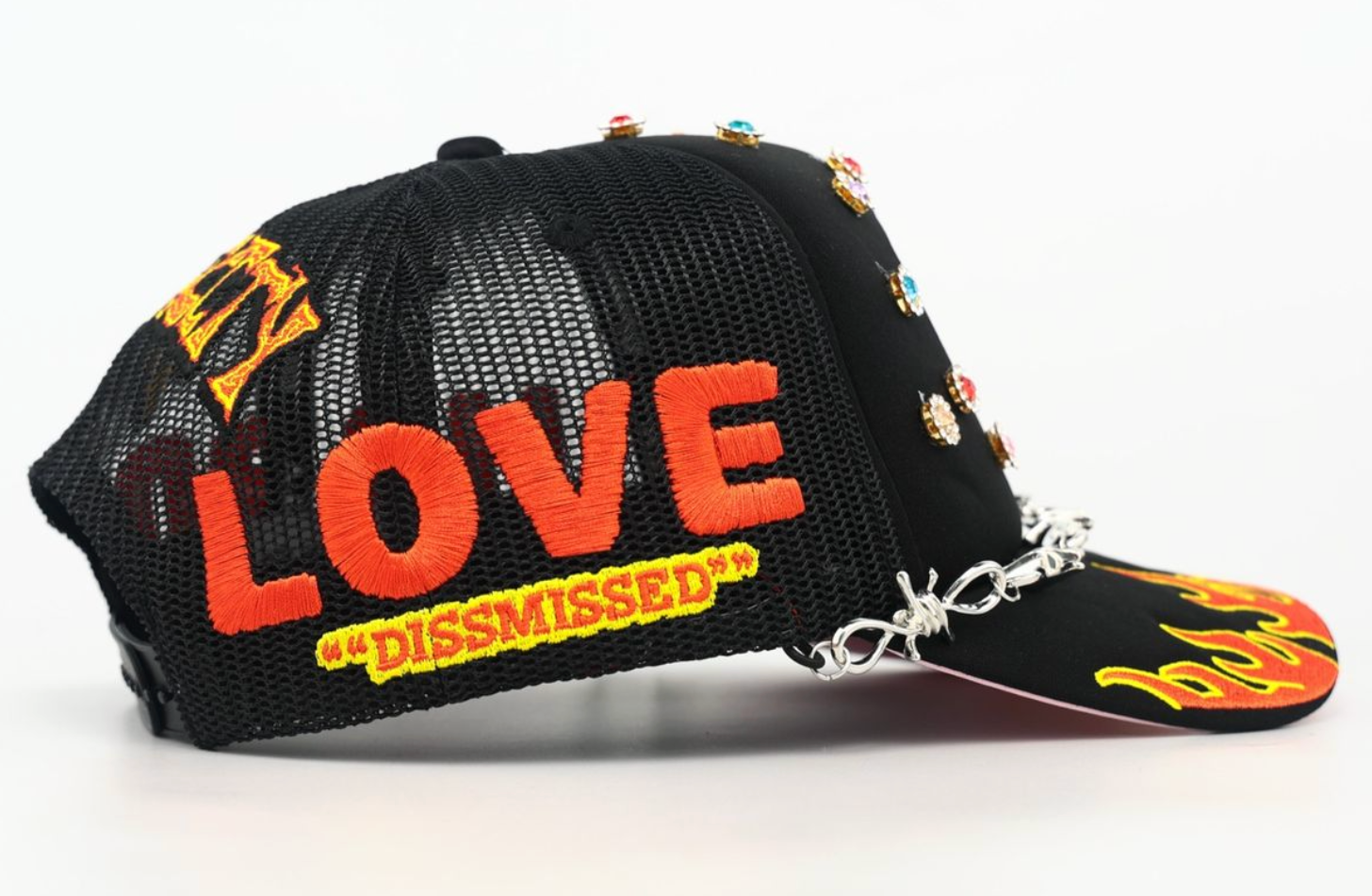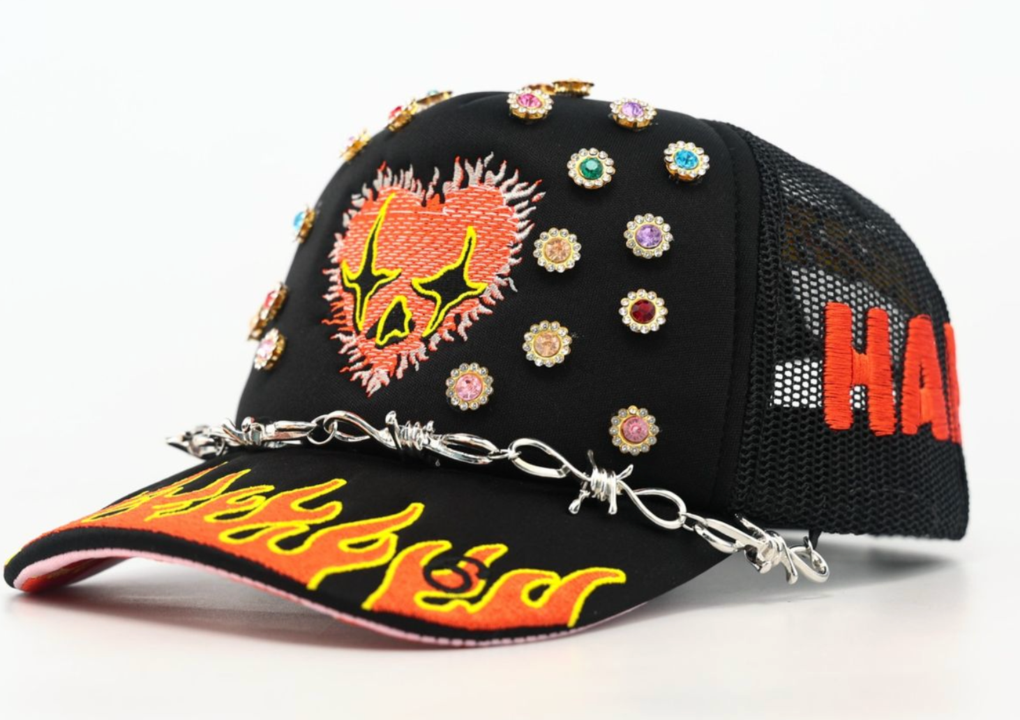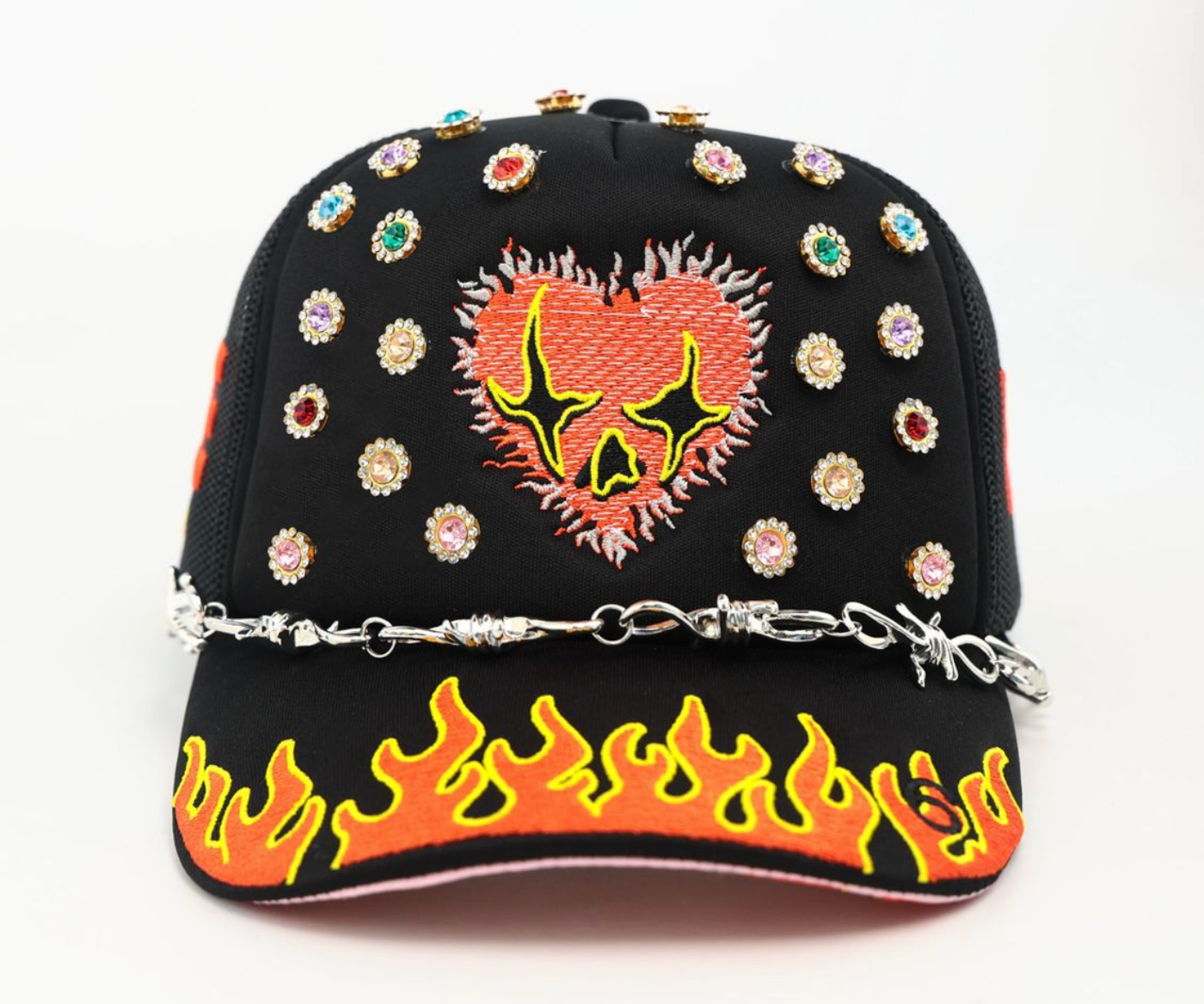 Mesh trucker snapback featuring all over embroidery / jewels.
