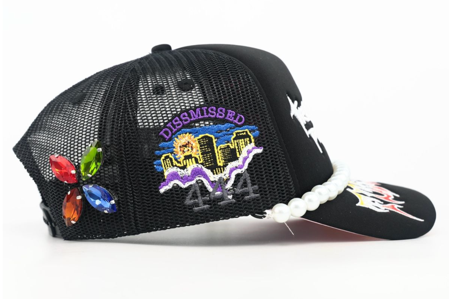 Mesh trucker snapback featuring all over embroidery / jewels.